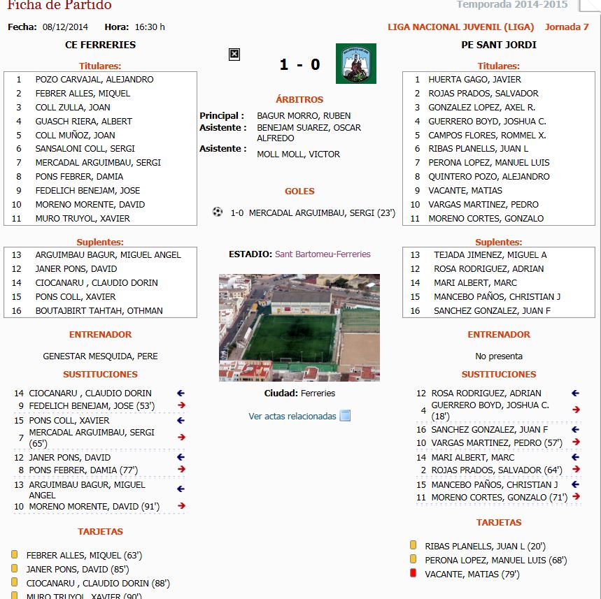 8 diciembre 2014 | Por lorenzo | Categoria: Fútbol RegionalPartido disputado en la tarde de este Lunes festivo y que corresponde a la Jornada numero 7 y que se aplazo hasta el dia de Hoy, Un triunfo muy importante para el Ferreries mientras que la Penya Sant Jordi se hunde tras seis Jornadas seguidas perdiendo