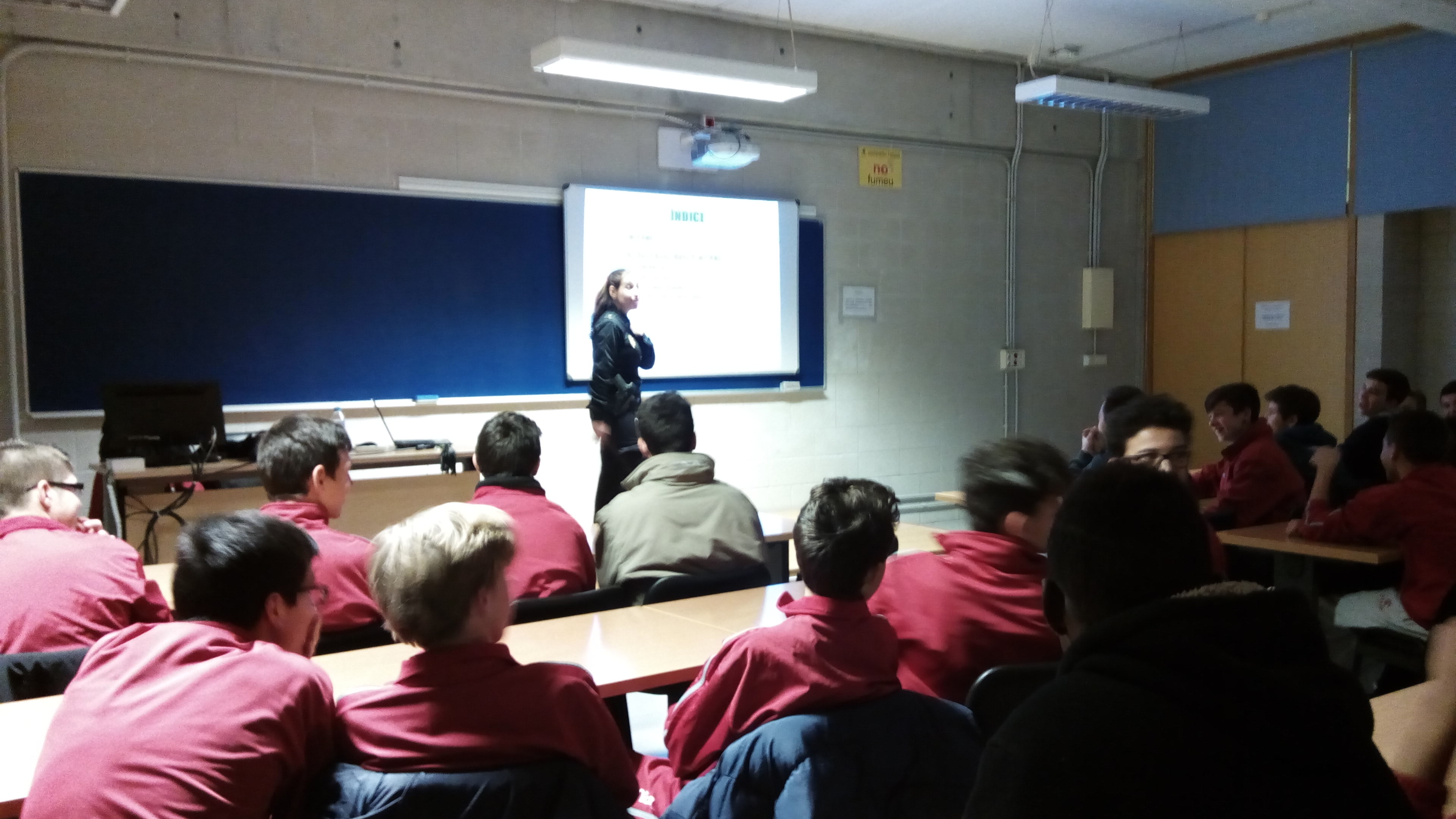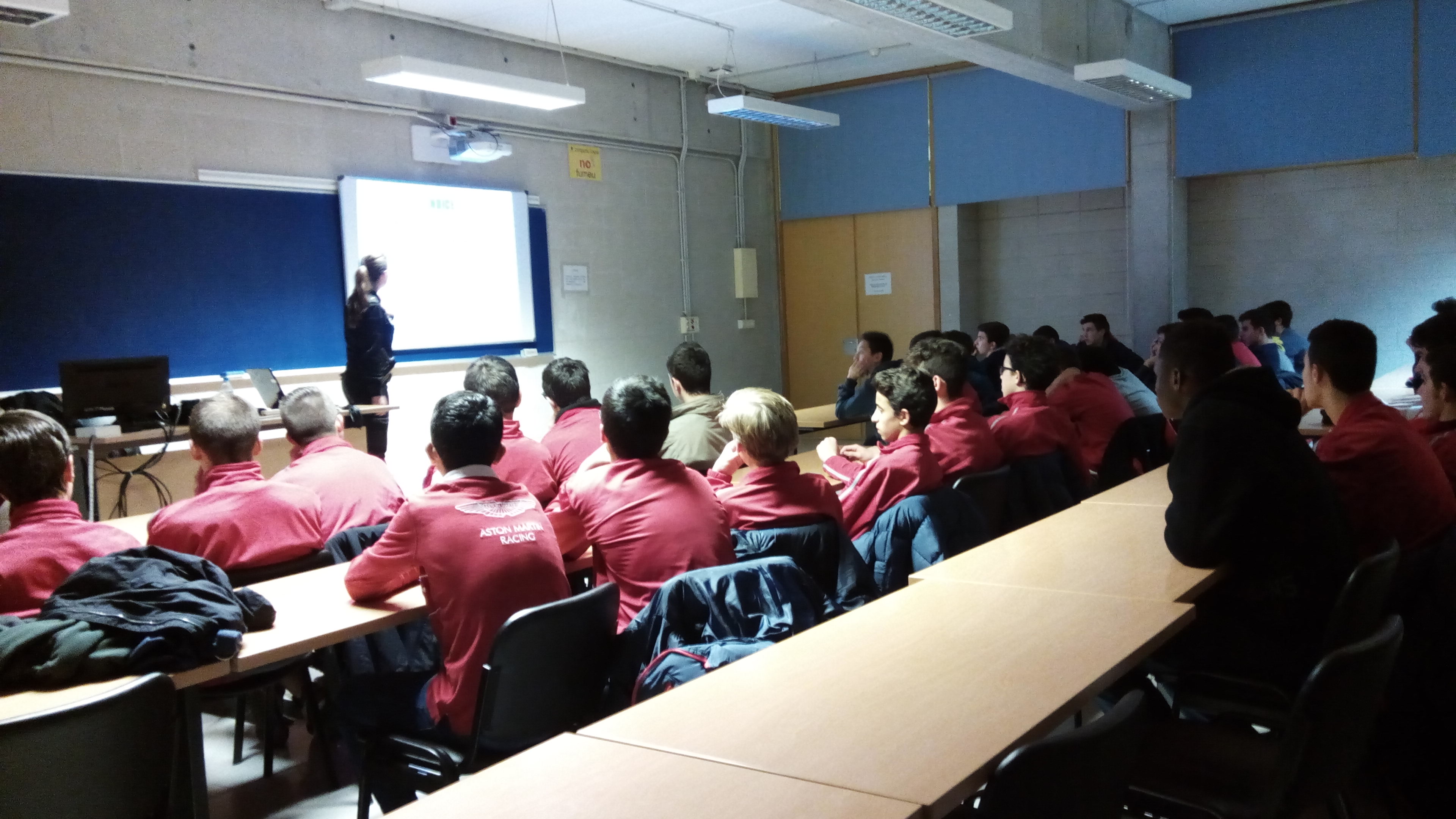 IMG_20150128_191102Jugadores Infantiles y Cadetes han asistido esta tarde a una charla sobre riesgos asociados a internet y redes sociales. La charla, impartida por una agente de la Unidad de Participación Ciudadana de la Policía Nacional de Palma ha tenido muy buena acogida entre los jugadores, ya que son usuarios activos de las nuevas tecnologías.