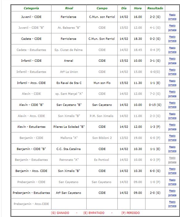 C.D. CIDE; Resultados Fin de semana