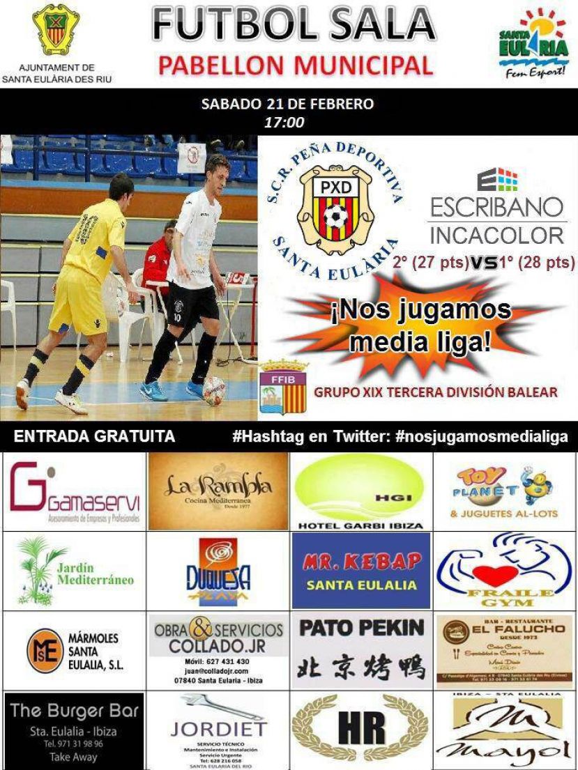 f5a85333d553b860310d6f60f5af8288_LEl equipo de Fútbol Sala de la Peña Deportiva Tercera División se juega la liga este sábado 21 de febrero a las 17.00h. en el Pabellón de Santa Eulalia del Río. La Peña, que se encuentra en segunda posición con 27 puntos, se enfrenta al líder ‘Escribano Incacolor’, el cual cuenta con únicamente un punto más que el equipo de Santa Eulalia.