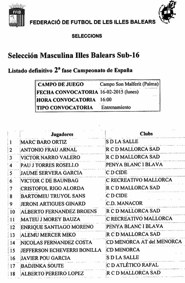 Nicolás Fernández, del Menorca At; Jefferson Echeverri, del CD Menorca amb sa sub-16 y David Camps, del Penya Esportiva i Ramón Huescar, del CD Menorca amb sa sub-18, serán es quatre jugadors menorquins que representarán s’isla a sa selección Balear per sa 2ª fase des campionat de Espanya de seleccions autonòmiques a ses  categories sub-16 y sub-18.