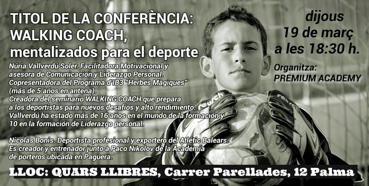 IMG-20150309-WA0001El próximo jueves 19 de marzo en el salón de actos de la Librería Quars,sita en C/Parellades 12 de Palma (Detrás de los juzgados de Via Alemania) tendrá lugar la conferencia “Walking Coach:Mentalizados para el deporte.”