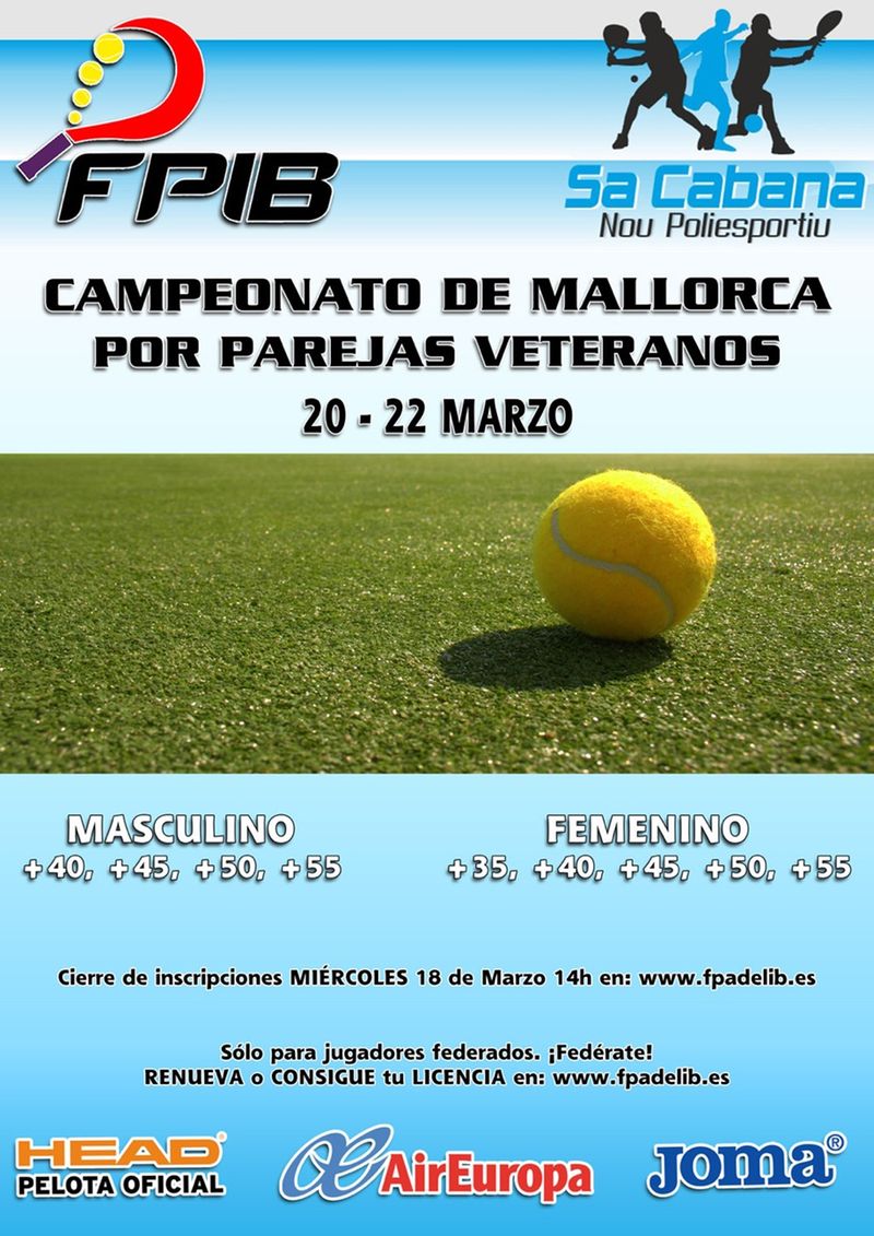 La semana que viene celebraremos en las instalaciones del club Nou Poliesportiu Sa Cabana el Campeonato de Mallorca por parejas de veteranos. Desde el viernes 20 de marzo y hasta el domingo 22 se disputarĂĄn los diferentes partidos en cada una de las categorĂas.Â