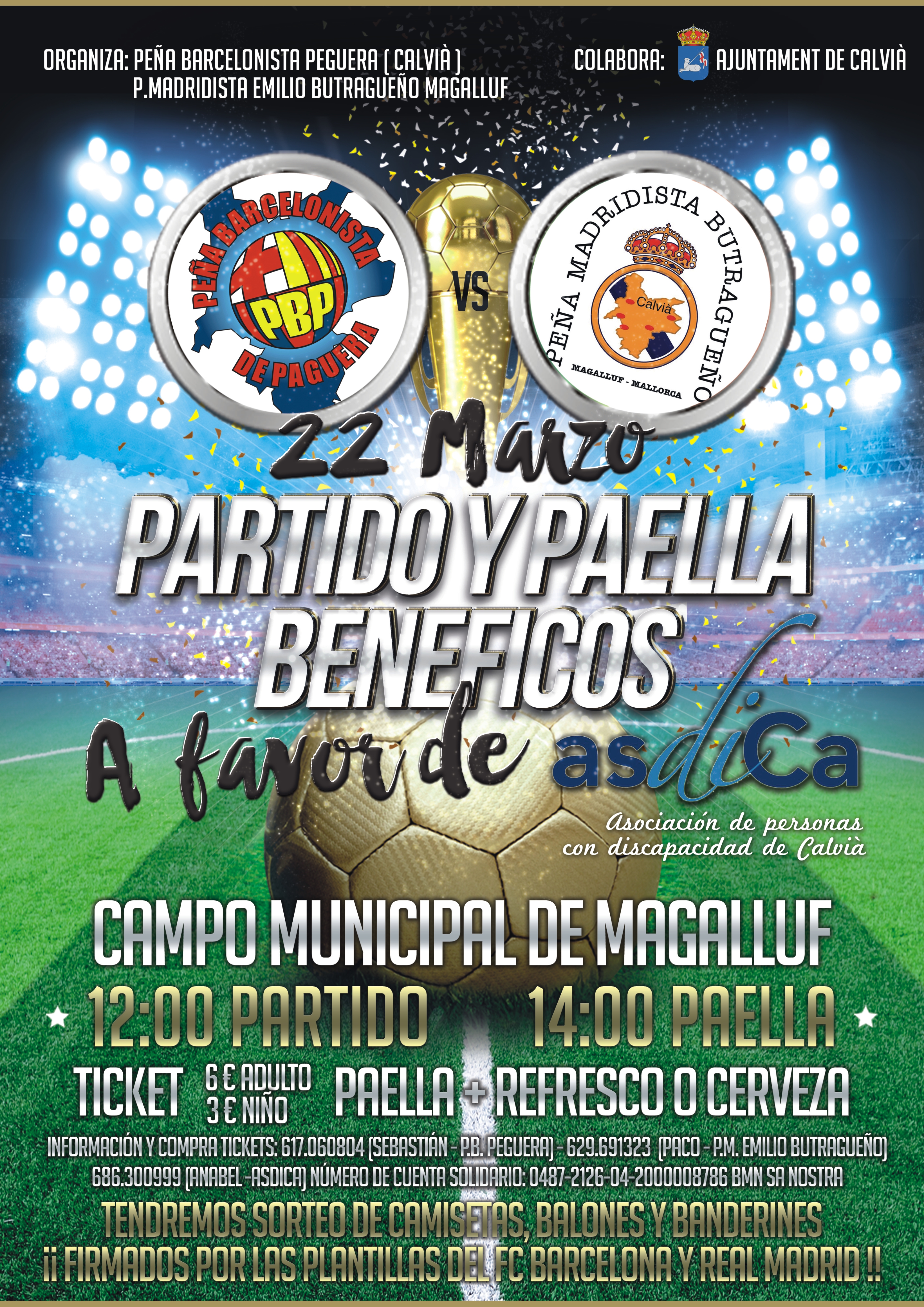 Cartel_PBP_PMEB_definitivoEste Domingo en el Campo Municipal de Magalluf (Calvià), tenemos que dar un empujoncito a Asdica Onl Calvià. Salvando siempre las distancias con el partidazo que se jugará a las 21:00 horas en el Camp Nou, la Penya Barcelonista Peguera – Calvia y la Peña Madridista Emilio Butragueño de Magalluf juegan su particular clásico. Aquí no habrá ni colores, ni puntos, ni rivalidades, solo un bien común que es obtener fondos para la Asociación de Discapacitados de Calvià. Al finalizar habrá una espectacular paella preparada por el prestigioso maestro paellero Germán Navas y habrá sorteo de material cedido por ambos clubes autografiados por las máximas estrellas de ambos equipos.