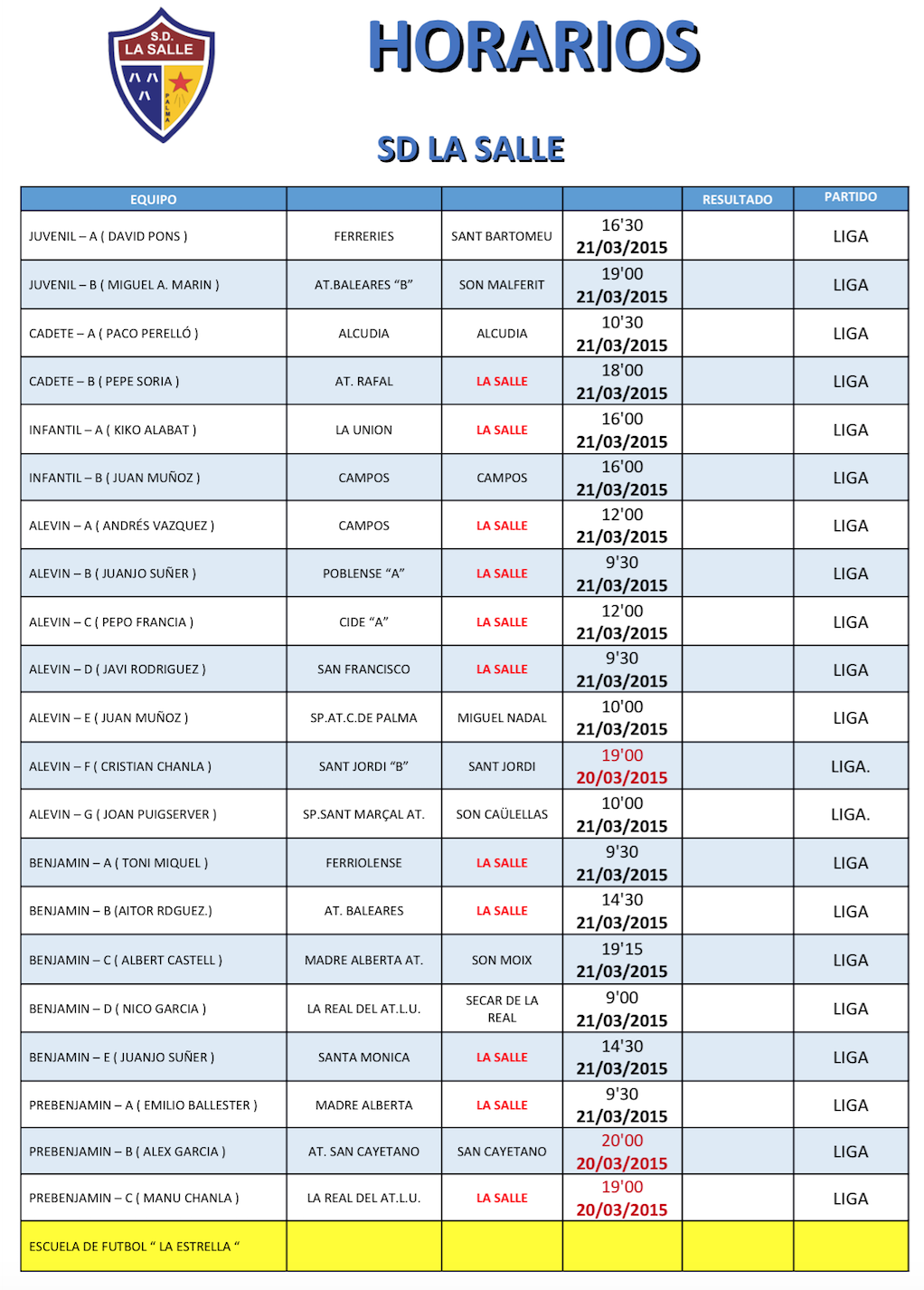 la SalleEstos son los Horarios de los diferentes equipos del club para este proxĂ­mo fin de semana