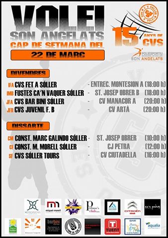 Cap de setmana de luxe a Son Angelats amb 7 partits de lliga a mes dels partits del Campionat de Balears Juvenil MasculÃ. A més, dissabte a les 4 les nostres Sénior del CVS Sóller Tours juguen el darrer partit de lliga amb el Campionat a la butxaca i amb moltes ganes de convertir el partit en una festa… tothom convidat!!!