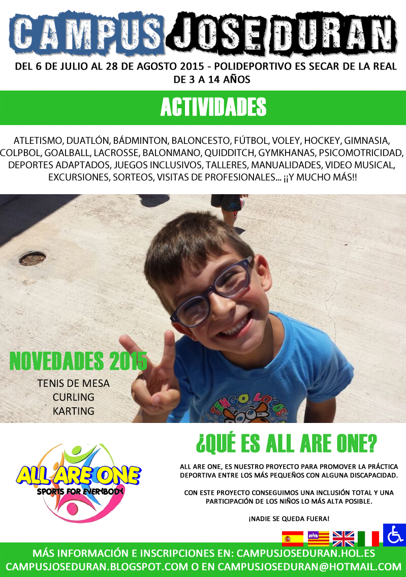 Con todas las plazas de Julio agotadas y buscando nuevas inscripciones en agosto os presento no sólo el folleto de este año, sino también nuestro proyecto «ALL ARE ONE», donde promovemos la práctica deportiva entre los más pequeños con alguna discapacidad.