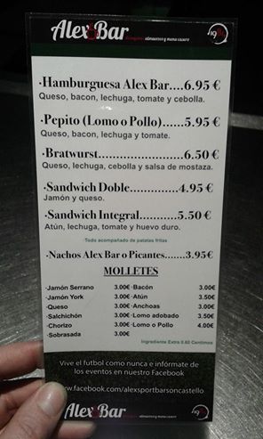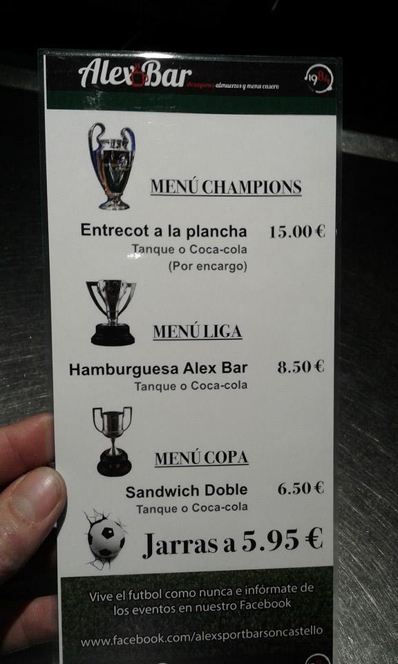 11150380_10206482581168873_3056425570028946048_nAlex Bar inauguración este Sabado os esperamos a todos , el Fútbol en estado Puro .