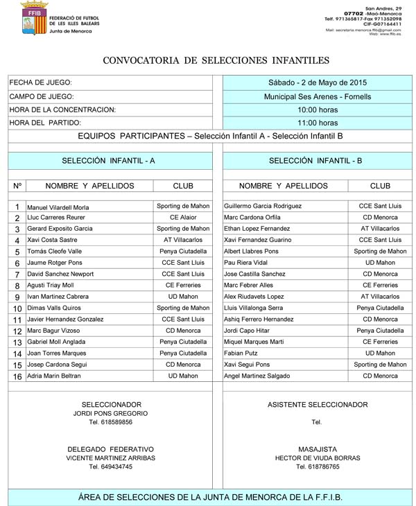 SELECCIONESNova convocatoria de sa seleccion infantil menorquina que es seleccionador Jordi Pons ha establert per es proper dissabte 2 de Maig a nes camp Las Arenas de Fornells per jugar Selecció Infantil A devant Selecció  infantil B.