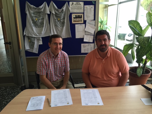 Carlos Maceda per part de la Ampa i José María Vidal per part del CCE Sant Lluís van signar el conveni que inclou entre altres la promoció del futbol entre els alumnes amb activitats complementàries amb el Coordinador José Ángel Moyano, i la promoció entre els alumnes de la Salle Maó del Joc de La Bolla.