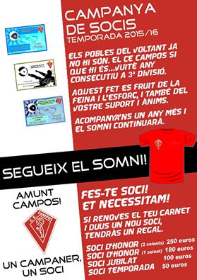 11800380_990352114349657_4509867809831600411_nPosam en marxa la campanya de socis d’aquesta temporada..SEGUEIX EL SOMNI!!!! UN CAMPANER, UN SOCI…ara més que mai vos necessitam i hem d’augmentar la família campanera.