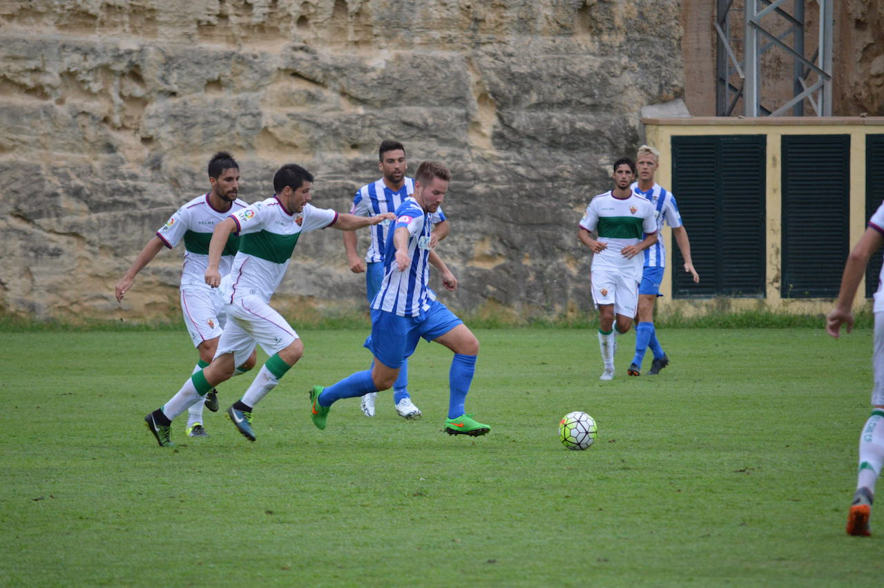 El Atlético Baleares se enfrentaba al rival con más categoría de la pretemporada, el Elche CF con las ideas muy claras: solidez defensiva y con el objetivo de mejorar el atrevimiento de cara a portería. Contra este rival recién descendido de Primera División, el cuadro de Siviero se plantaba en el campo de Campoamor intentando tener el control del balón y mostrar las intenciones en el aspecto ofensivo. Antes de cumplir los diez primeros minutos, Kike López ya podía avanzar a los baleares en un saque de falta en una jugada ensayada. Hasta dos ocasiones se apuntaban los blanquiazules pero el gol de los alicantinos llegaría muy pronto. En una jugada de Álvaro Giménez por banda, el delantero la pondría milimétrica para que Pedro Astray rematara ante Pliquett sin que el alemán pudiera hacer nada.