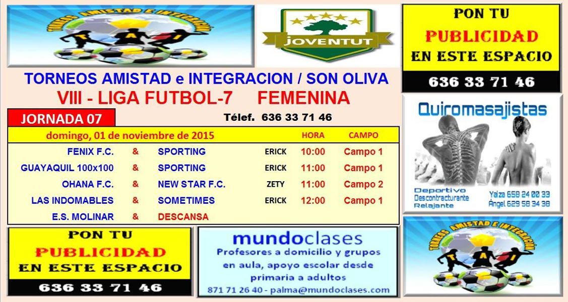 HORARIOS JORNADA 07 VIII – LIGA FÚTBOL-7 FEMENINA , DOMINGO 01 DE NOVIEMBRE DE 2015