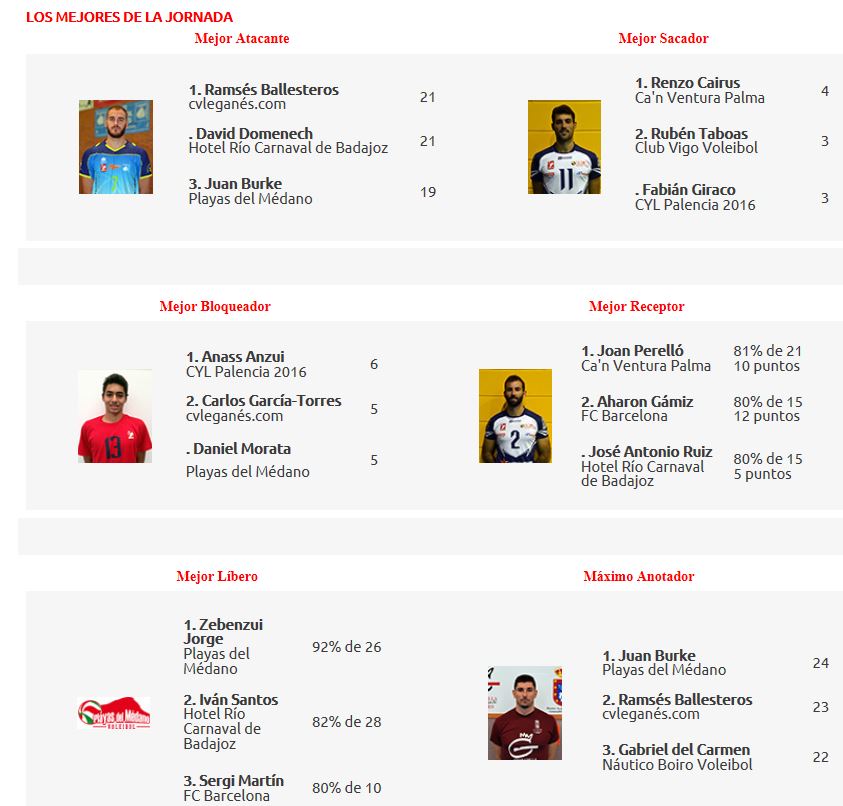 Dos jugadores del equipo lÃder de la competición, C.V. Ca,n Ventura Palma encabezan sendas listas individuales de la jornada, ya que Renzo Cairus es el mejor sacador del fin de semana, mientras que su compañero de equipo Joan Perelló lidera la lista de receptores. El jugador de Playas del Médano, Zebenzui Jorge repite al frente de la lista de lÃberos y se lleva nuevamente el puesto en el siete ideal de la jornada.