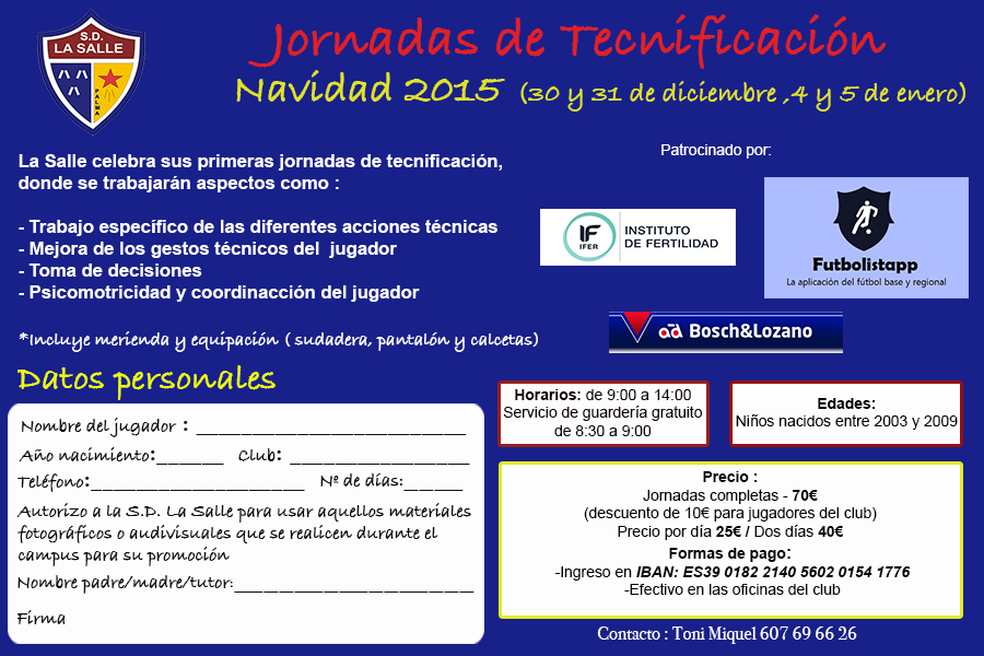 la S.D. la Salle informa del inicio de las primeras jornadas de tecnificación durante los días 30 y 31 de Diciembre asi como 4 y 5 de Enero
