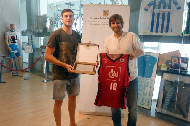 Sergio-García-y-Carles-GonyalonsEl director general de Deportes y Juventud, Carles Gonyalons, ha recibido al jugador de baloncesto mallorquín Sergi García. El base ha entregado a Gonyalons su camiseta con el CAI Zaragoza para que sea incorporada al museo del Centro de Inpterpretació del Deporte de las Illes Balears, situado en la primera planta de las instalaciones del velódromo Palma Arena. Mientras tanto, en un acto de intercambio, el director general de Deportes y Juventud le ha hecho entrega de una placa como distinción del Govern de les Illes Balears por los méritos deportivos del jugador palmesano, el cual pasó por el Centro de Tecnificación Esportiva de las Illes Balears, de Príncipes de España.