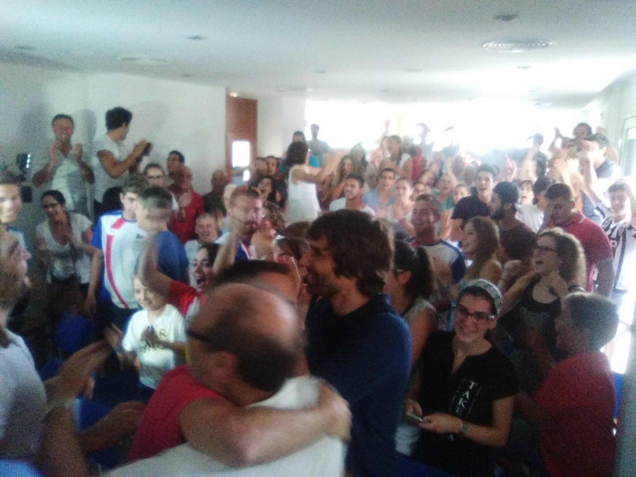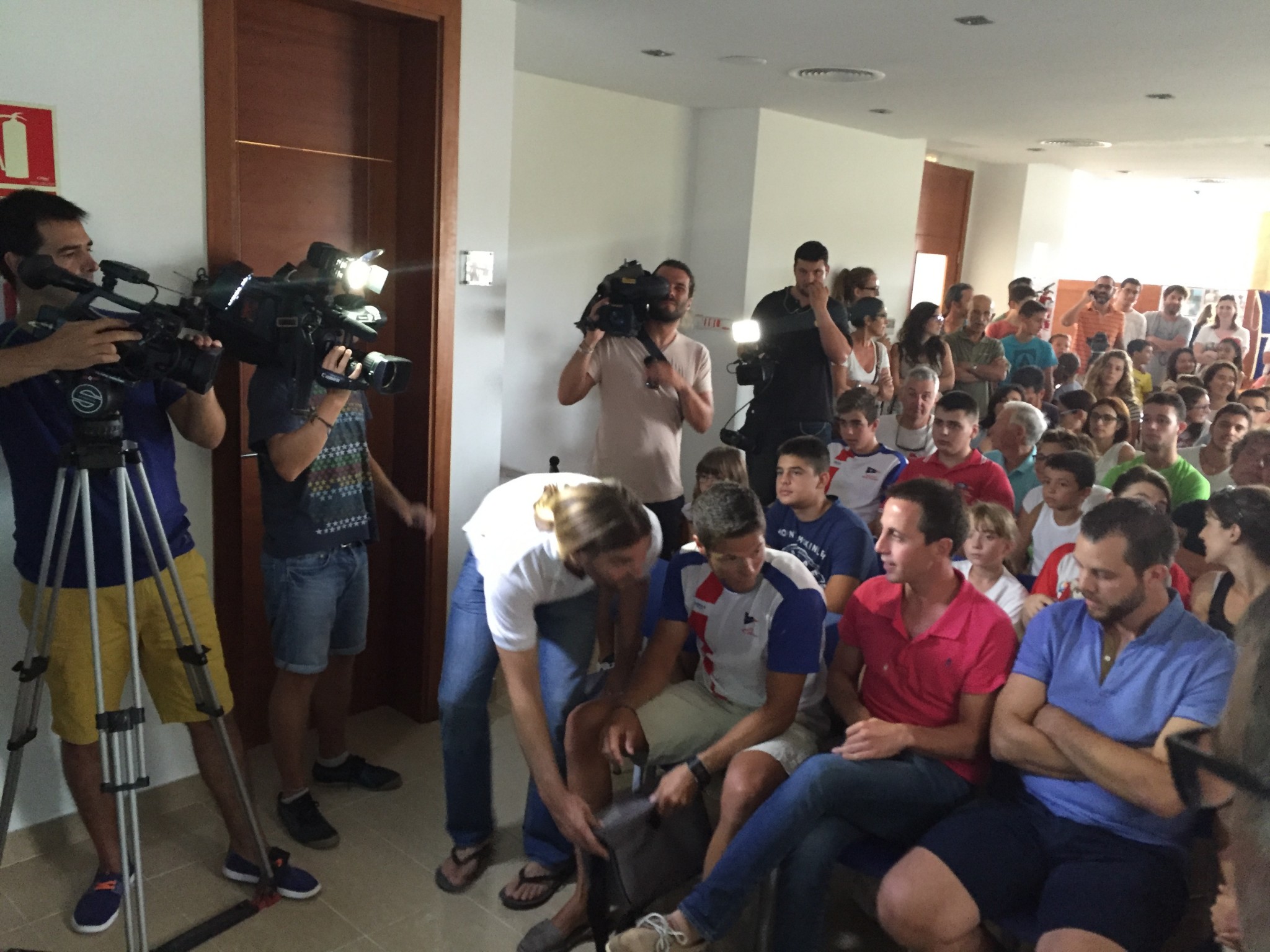 Engalanada la sede social del club con las banderas y repleta de cámaras para registar un momento histórico para el piragüismo balear comenzó la tarde con la primera gran ovación al salir en la pantalla por primera vez el actor principal.