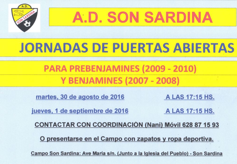 La A.D. Son sardina organiza unas jornadas de puertas abiertas con la finalidad de completar sus plantillas de categorÃa PrebenjamÃn (niños y niñas nacidos en 2009 y 2010) y BenjamÃn (nacidos en 2007 y 2008) los próximos dÃas 30 de agosto (martes) y 1 de septiembre (jueves) a las 17:15 h. en el campo de Fútbol de Son Sardina.Para más información contactar con la Coordinadora Deportiva del Club, Nani Haces, en el teléfono 628871593.