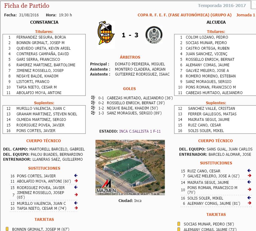 Muy dificil se lo puso al Contancia el Alcudia que ya se puso con un 0-2 con el que termino la primera parte, ya en la segunda el Constancia acorto distancias pero en el ultimo minuto seria el Alcudia el que pondria la puntilla el partido poniendo de cara esta eliminatoria cuya vuelta sera el proxÃmo Miercoles.
