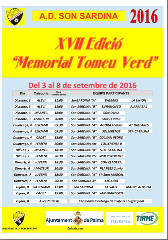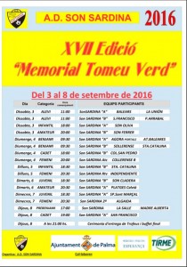 Arranca la XVII Edición del Trofeo “MEMORIAL TOMEU VERD” que, como todos los años, desde el 2000, y coincidiendo con las Fiestas Patronales de la Barriada de Son Sardina, organiza el Club A.D. Son Sardina como homenaje a D. Bartolomé Verd quien fuera Directivo del Club y uno de los impulsores del Fútbol Base y del Fútbol Femenino en las Islas.