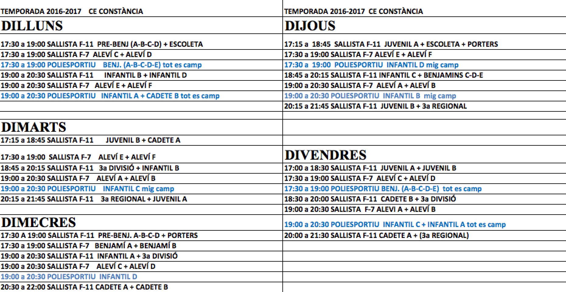 Horaris d’entrenament a partir d’avui.
