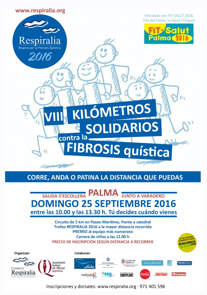 cartel-kilometros-solidarios-finalLa Fundación Respiralia y la Asociación Balear de Fibrosis Quística organizan la octava edición de la carrera popular “Kilómetros solidarios contra la Fibrosis Quística”. Será el domingo 25 de septiembre, de 10:00 a 13:30, en el Paseo Marítimo de Palma con salida en el Camí de S’Escollera, dentro de la Fit Salut Palma 2016 organizada por el Ayuntamiento de Palma (IME).