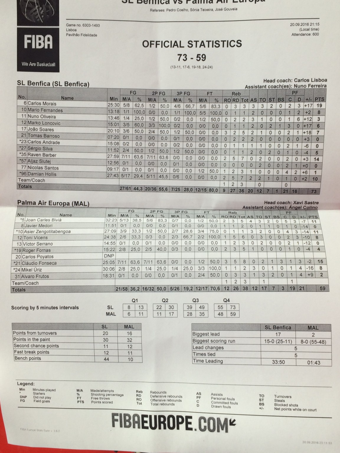 Primer periodo de mucha igualdad que empezaba con un buen Palma Air Europa que conseguía hacer cirular bien el balón, pero que se encontraba con un Benfica con mucho físico que lograba hacerse fuerte atrás y cerrar el primer periodo con una ligera ventaja de 2 puntos (13-11).