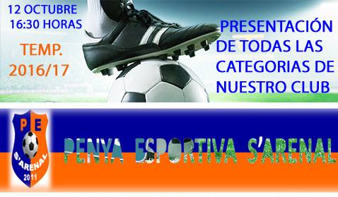 14484700_344703322538839_4608844916331273405_nEl Próximo miércoles 12 de Octubre se presentan todos los equipos de la Penya Esportiva S´Arenal de la Temporada 2016/2017. El evento empezará a las 16:30. Ojo….. los jugadores deben estar a las 15:00 en el campo. con ropa de paseo y la equipación oficial.