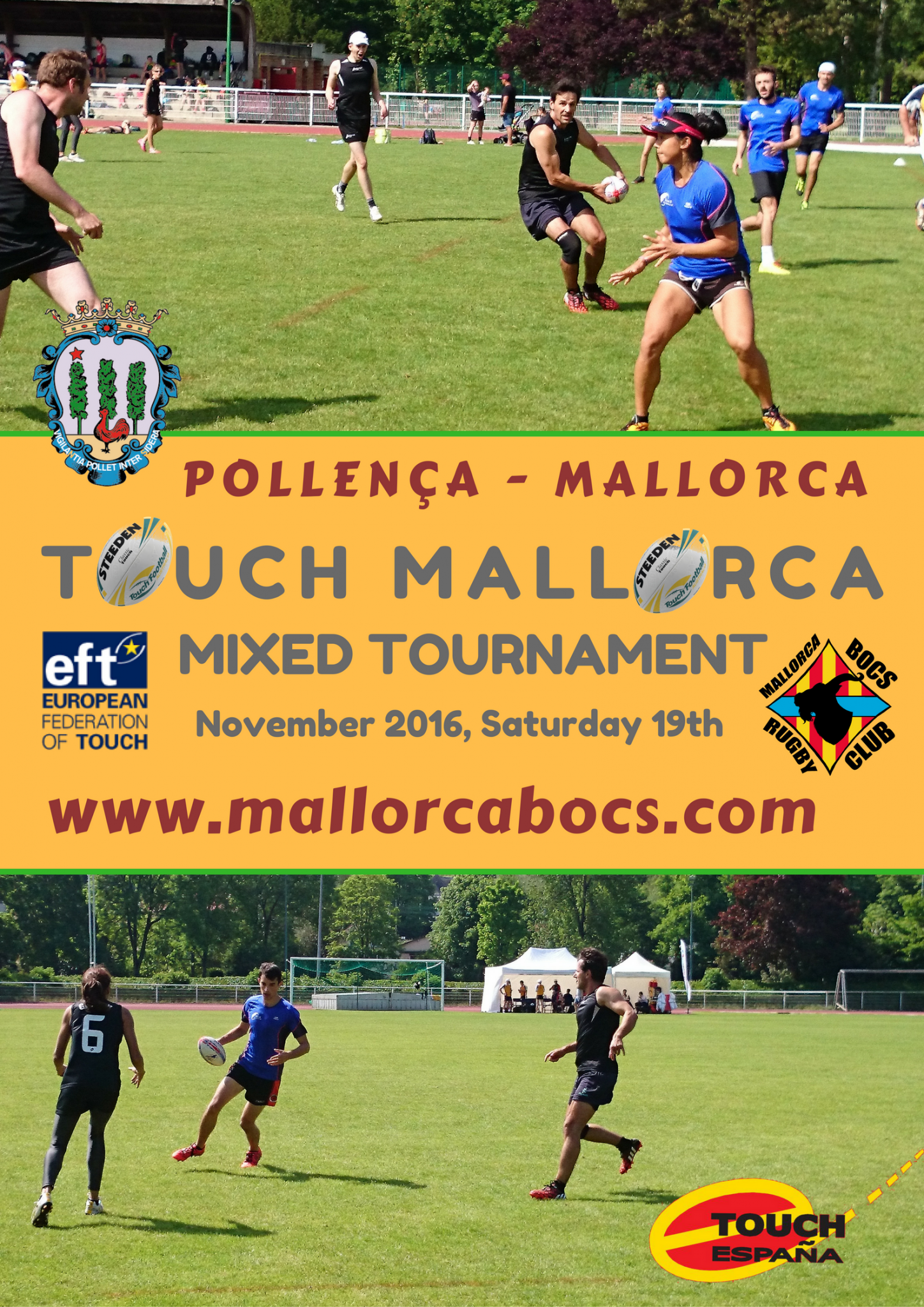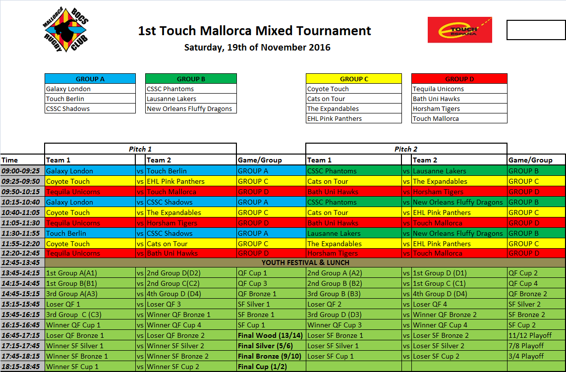 calendari de partits del Touch Mallorca Mixed International Tournament 2016 que es celebrarà al Poliesportiu Municipal de Pollença, el dissabte 19 de novembre, a partir de les 9:00 del matà fins a les 19:30 de l’horabaixa.