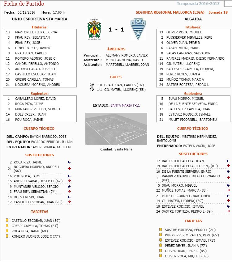 Partido dominado en esta primera parte por el Sta.Maria con varias ocasiones pero que finalmente no se consiguierĂłn , de ahi a que se llegara con el 1-0 conseguido en el minuto 16 por parte de Carles Grau