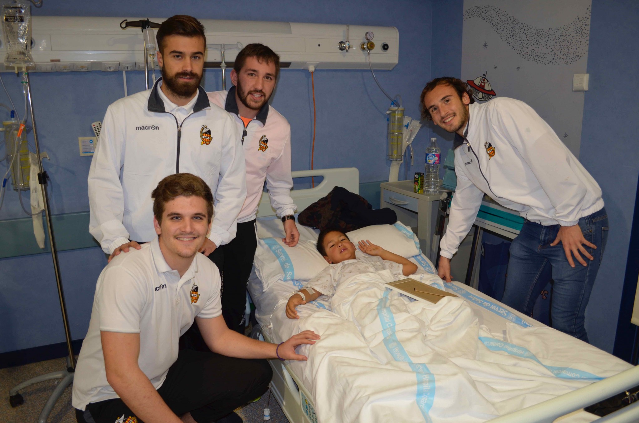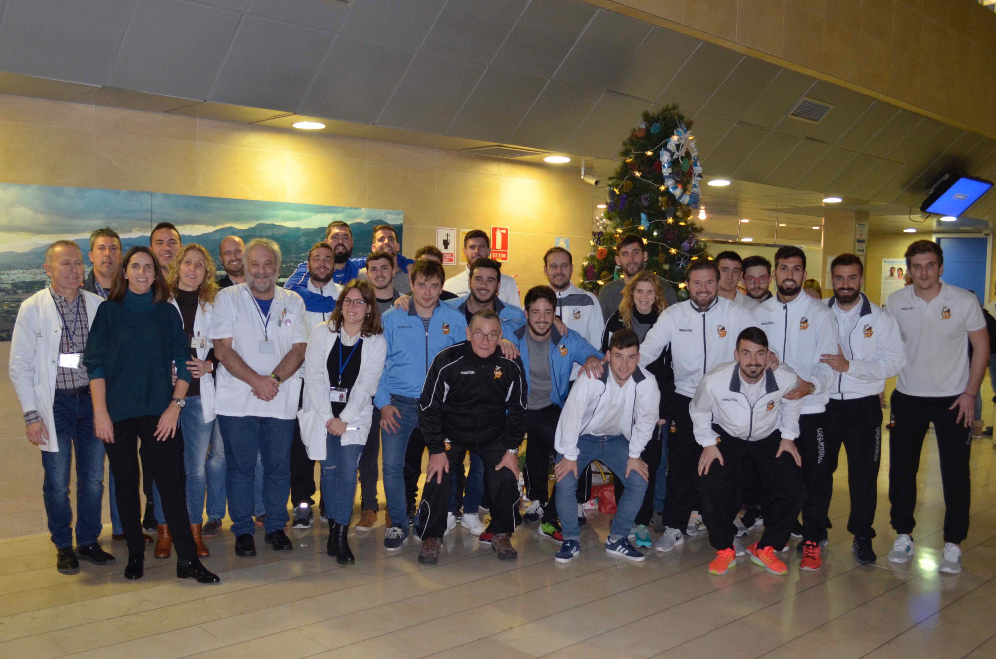 El director médico del centro, el doctor Onofre Pons, el director  y subdirectora de gestión, Xisco Ferrer y María Morlà, han guiado a jugadores y entrenadores por las diferentes plantas del hospital para que los pacientes ingresados pudieran recibir la visita de los miembros del club.