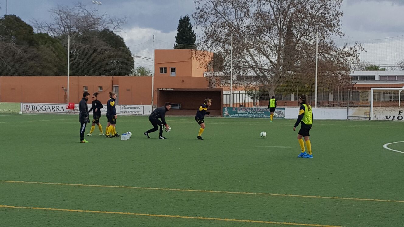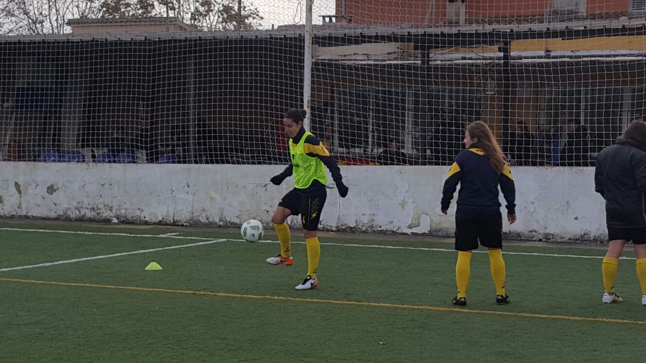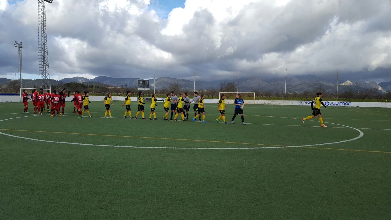 El partido se inició, como el día, frío por parte de los dos equipos aunque con mayor posesión del balón y dominio en el centro del campo de las catalanas del Pallejà que, si bien no han creado grandes ocasiones de gol, si han conseguido asustar a las locales en el juego a balón parado, fruto del cual, dos saques de esquina se han saldado con sendos disparos a la madera en intentos de conseguir goles olímpicos aprovechando el viento a favor.