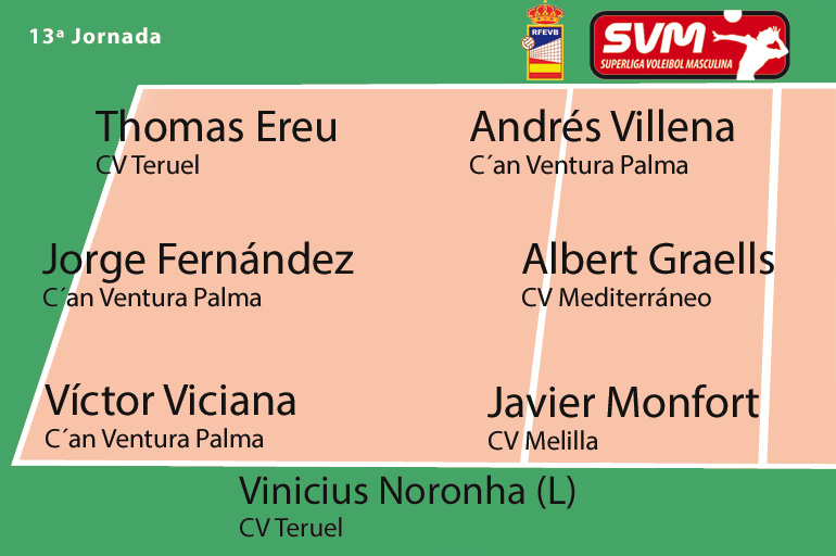 En uno de los puestos de central, el capitán de C´an Ventura Palma Jorge Fernández se ganó un lugar en el siete gracias a su completa actuación con 12 puntos, 3 saques directos y 3 bloqueos. El otro central del equipo ideal es Albert Graells de CV Mediterráneo que sumó 6 bloqueos, el top de la jornada.