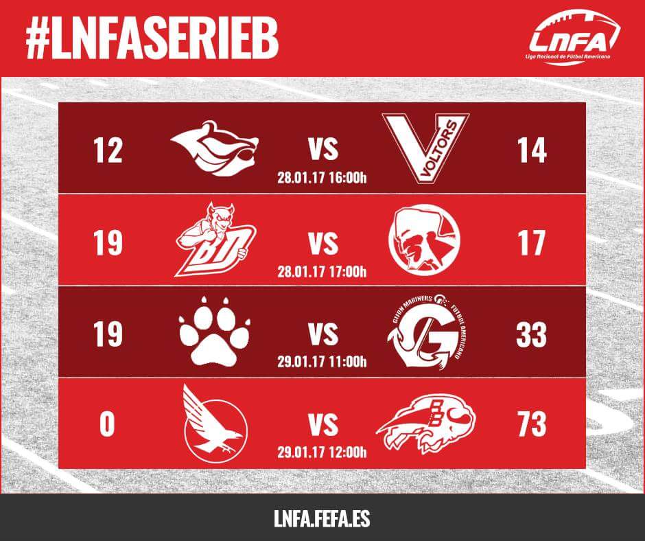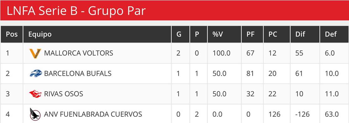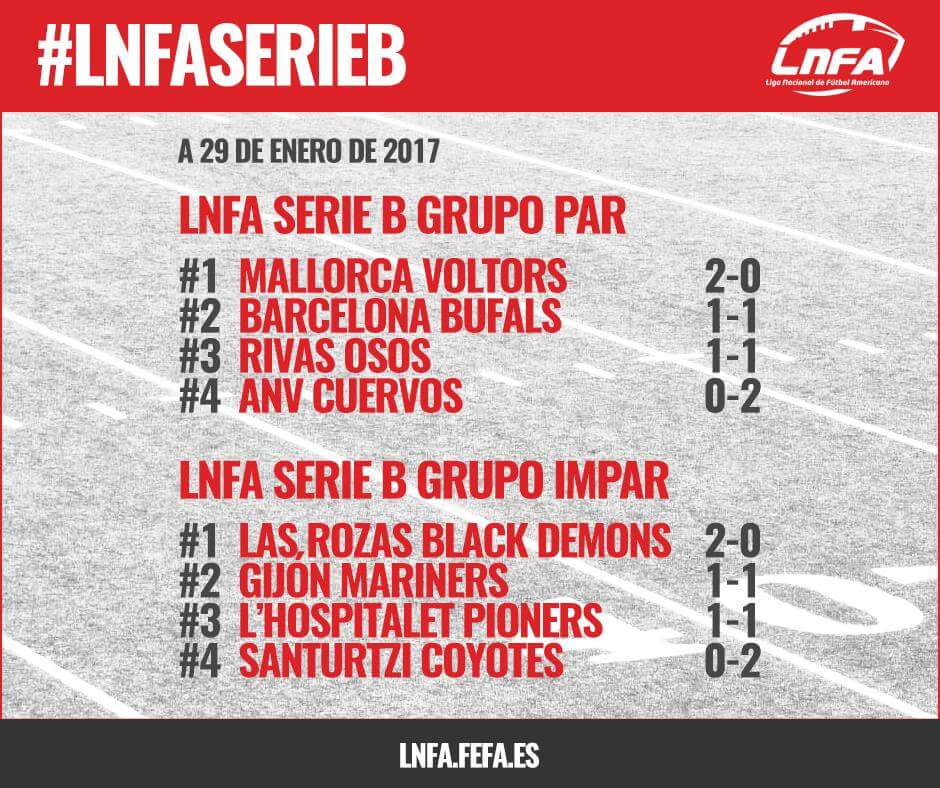 LNFA SERIE B. JORNADA 2 Black Demons y Voltors, en cabeza LG Oled Las Rozas Black Demons y Mallorca Voltors se han colocado al frente de la clasificación tras la disputa de la segunda jornada. En el grupo Impar Black Demons venció a L’Hospitalet Pioners por 19-17 para situarse como líder, mientras que en el grupo Par Voltors hizo lo propio asaltando el feudo de Osos Rivas (12-14). En ambos encuentros Pioners y Osos remontaron en los minutos finales, pero no consiguieron dar la vuelta al marcador. En los otros dos encuentros de la jornada, Gijón Mariners sumó su primer triunfo de la temporada en su visita al campo de Santurtzi Coyotes (19-33) y Barcelona Búfals también estrenó su casillero de victorias a costa de unos Fuenlabrada ANV Cuervos que están sufriendo en su debut en la Serie B (0-73). La tercera jornada se disputará el fin de semana del 11 y 12 de febrero, con los siguientes enfrentamientos: Las Rozas Black Demons-Santurtzi Coyotes, Barcelona Búfals-Mallorca Voltors, L’Hospitalet Pioners-Gijón Mariners y ANV Fuenlabrada Cuervos-Osos Rivas.
