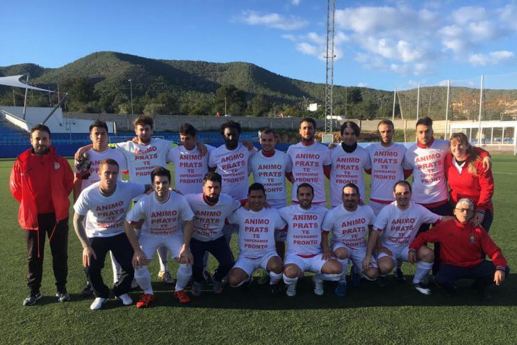 CD-IbizaPaco Natera En una jornada donde se han suspendido dos encuentros debido al temporal de viento que ha azotado la isla este domingo (el Sant Jordi-Portmany y el Formentera B-UD Ibiza), el protagonismo se lo ha llevado un veterano futbolista que fue operado con éxito el viernes pasado tras romperse el peroné de su pierna izquierda en el último partido. Se trata de David Prats, el guardameta del CD Ibiza, que se ha emocionado después saber que sus compañeros, antes del encuentro ante el Atlético Jesús, han portado camisetas de apoyo en un momento tan complicado donde podía leerse: “Ánimo Prats, te esperamos pronto”.