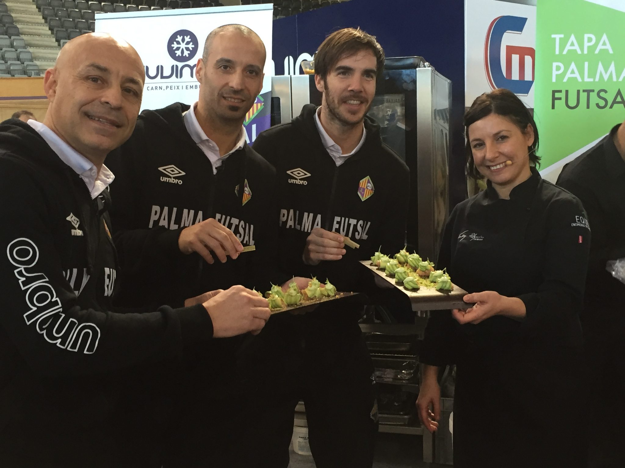 Langostino, aguacate, salsa de ostras, mostaza, lima, pan de sifón… Son algunos de los ingredientes que incluye la tapa “Palma Futsal” que ha diseñado la concinera mallorquina Vicky Pulgarín, ganadora del programa televisivo Masterchef, y que ha presentado la empresa Juvimar en su stand en la feria de la hosterería y restauración Horica, que se celebra estos días en el Palma Arena. La diseñadora de dicha elaboración ha reproducido la misma junto a Antonio Vadillo, capitán del Palma Futsal, este lunes en el stand de Juvimar con la presencia de toda la plantilla que ha tenido la oportunidad de probar la creación que estará disponible para todos los que acudan a la feria estos días.