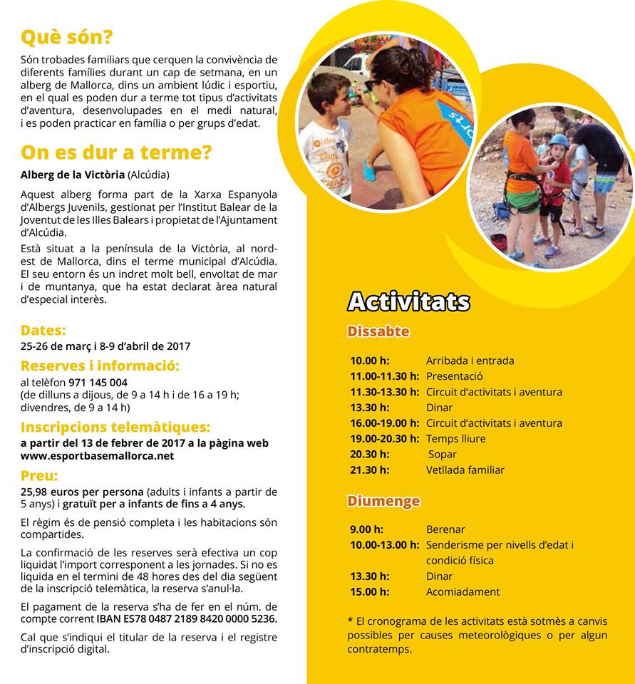 Des d’avui està obert el termini d’inscripcions pels caps de setmana d’aventura a l’Alberg de la Victòria, a Alcúdia, els pròxims 25 i 26 de març i 8 i 9 d’abril…‘Jornades d’Aventura Familiars’