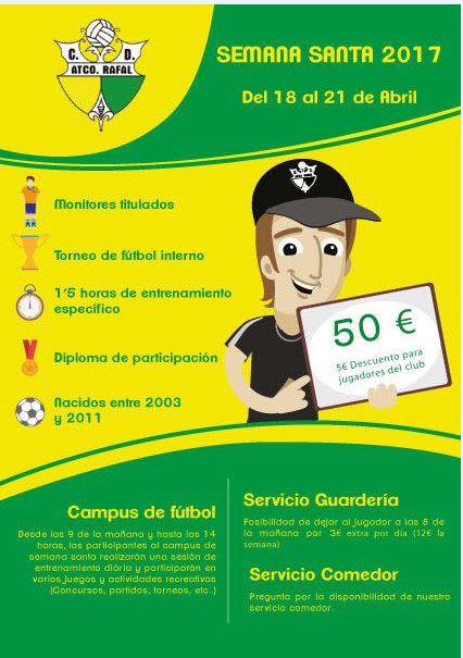 Durante los dÃas 18 y 21 de abril se celebrará el Campus de Semana Santa del CD Atlético Rafal para los jugadores nacidos entre 2003 y 2011. El Campus dispondrá de todos sus monitores titulados y en el cierre del mismo se hará entrega de diplomas por su participación. Además, nuestro Campus ofrece servicio extra de GuarderÃa y Comedor.