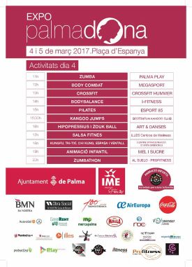 Una fira dedicada a la dona, la salut i l’esport que es durà a terme els dies 4 i 5 de març a la plaça d’Espanya, on es podran visitar els expositors de diferents entitats, empreses, gimnasos i centres de fitnes, els quals oferiran els seus serveis enfocats a la dona. També s’hi trobaran les carpes per a la recollida de dorsals de la II cursa popular Palmadona. Un gran escenari oferirà activitats dirigides gratuïtes i música en els següents horaris: