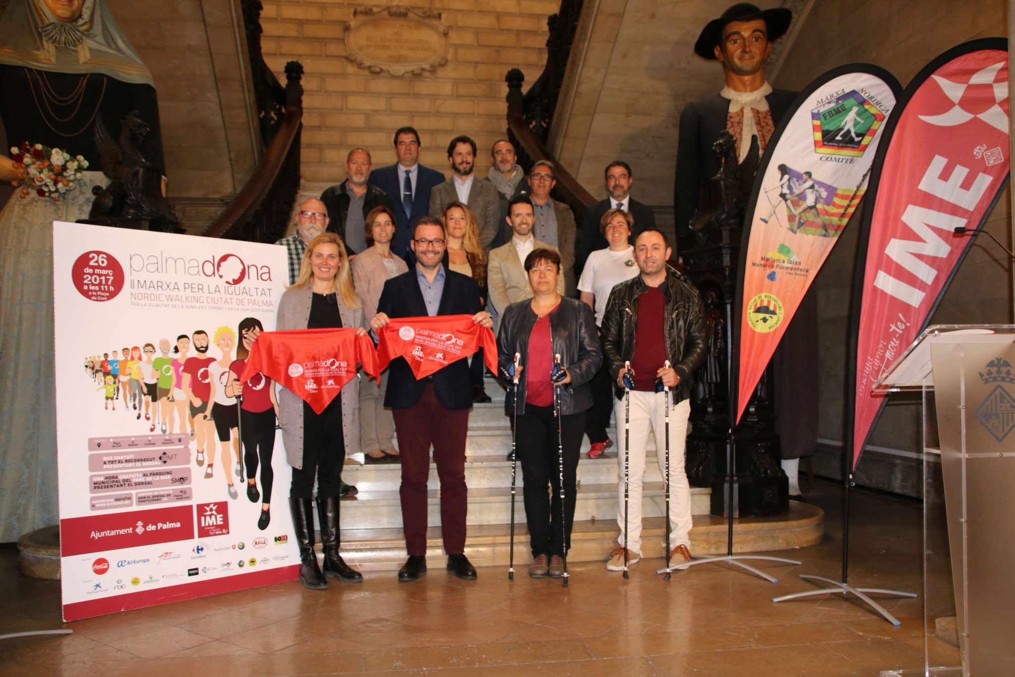 Palma, 21 de març.-El batle de Palma, Jose Hila i la regidora d’Educació i Esports, Susanna Moll i altres regidors de la corporació, juntament amb diferents patrocinadors i col·laboradors que participen en aquest esdeveniment, han presentat avui al vestíbul de Cort la II Marxa per la Igualtat Nordic Walking Ciutat de Palma que es celebra aquest diumenge.