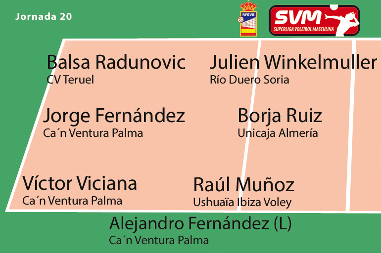 El colocador de Ca´n Ventura Palma VÃctor Viciana se ha erigido en el MVP De la vigésima jornada. De sus manos surgió la reacción del conjunto palmesano tras ir cediendo 0-2 en el derby balear. El colocador almeriense contribuyó al triunfo de su equipo con cinco puntos directos de saque, cuatro bloqueos, dos puntos de ataque y llevando a cuatro de sus compañeros a superar la decena de puntos, unos guarismos que le permiten volver a ser el MVP de la jornada.