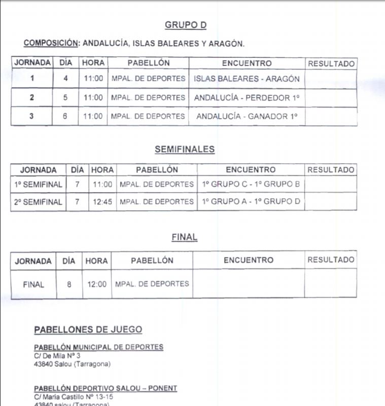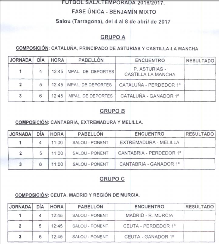 La Federación Catalana de Fútbol ha designado la localidad de Salou (Tarragona) como sede del Campeonato de España de Selecciones Autonómicas BenjamÃn Fútbol Sala Mixto organizado por la Real Federación Española de Fútbol. Este campeonato se celebrará entre los dÃas 4 y 8 de abril con un total de trece selecciones participantes. Asimismo, la territorial anfitriona y la RFEF han hecho públicos los horarios definitivos y los pabellones que acogerán todos los encuentros