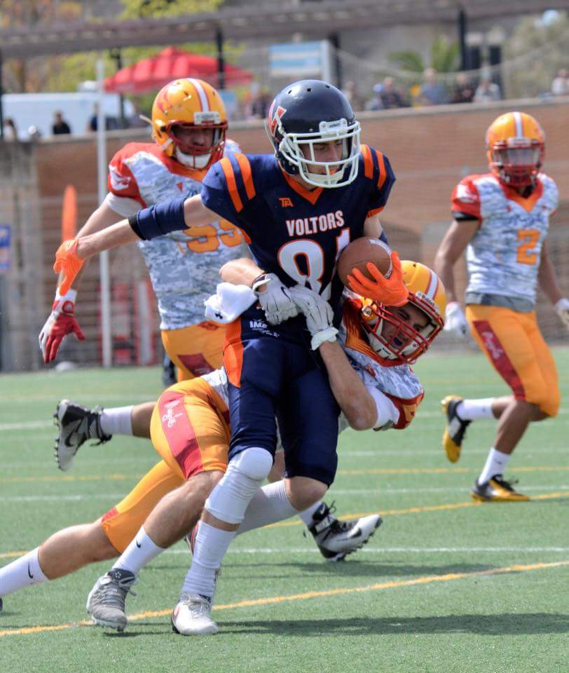 Hubo que esperar al segundo cuarto para estrenar el marcador, en una gran intercepción del capitán Jesús Ortiz LB#11 que supo leer el pase del QB mejicano de Osos, muy presionado por la defensa, atrapar la pelota y correr hasta le end-zone muy bien arropado por la defensa de Voltors convertida ahora en ataque, ante la sorpresa del ataque madrileño, logrando  un espectacular touchdown. Con el chut bueno por parte de Tolo QB#19, subÃan los primeros 7 puntos al marcador y las gradas lo festejaban ilusionados. Pero los Osos de Rivas no tardaron en responder con una jugada de carrera de su RB#27 mejicano para touchdown. El chut no sumó el punto extra al ser bloqueado por la fuerte presión que realizaba la defensa local. Con un Voltors 7, Osos 6, los de Juan Serrano apretaban los dientes para intentar aumentar la ventaja. Un gran pase Tolo QB#19 que conectaba con el veloz Xavi Guillen WR#13 que atrapó la pelota y corrió casi hasta la zona de anotación. Situación que los Voltors aprovecharon de la mano de Isaac León RB#40, en una potente carrera a falta de dos minutos para llegar al descanso. El punto extra (Tolo QB#19) también subió al marcador que lucÃa un increÃble 14 a 6 a favor de los locales. El ataque visitante, lejos de bajar los brazos, volvió a sorprender con contundencia y encontró hueco para una magnÃfica carrera de su corredor mejicano RB#27 que cruzó más de medio campo, dejaba a los Osos a las puertas del TD. Ahora la oportunidad era para los de blanco y amarillo a falta de menos de un minuto para la media parte, y en una jugada de pase del QB mejicano con buena recepción del #11 rivense que anotaba el touchdown. Los de Rivas optarÃan por la jugada de 2 puntos para empatar el partido, la tensión ponÃa en pie a la grada de Son Moix. Osos realizaba un amago jugada de pase pero fue su QB mejicano el que corrió para sumar los dos puntos extras justo antes del final del segundo cuarto. Sin tiempo para más se llegaba al final de la primera mitad con un empate a 14 puntos que dejaba todo como al principio.