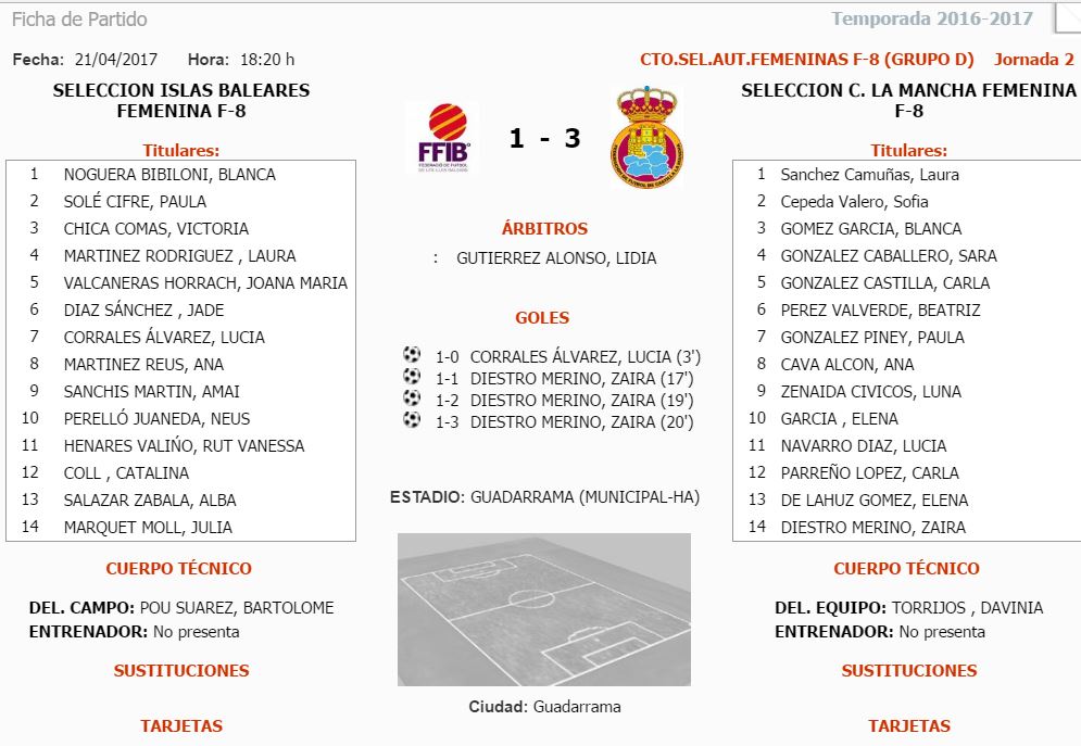 Del 21 al 23 de abril de 2017, en el Campo Municipal de Guadarrama «Nuevo «Raso» (Comunidad de Madrid), se disputará el XVI Campeonato Nacional Selecciones Autonómicas Femeninas sub-12-Fútbol-8.