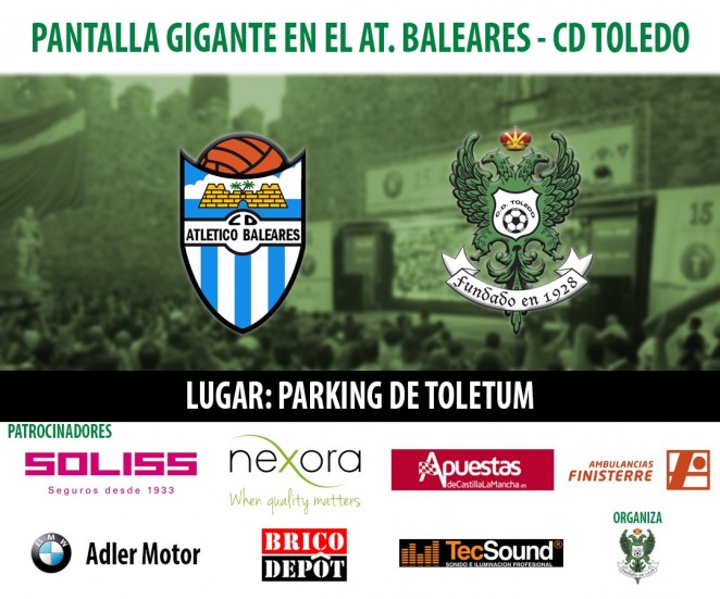 El Club Deportivo Toledo en colaboración con los patrocinadores del club instalará una pantalla gigante de televisión, en el parking del Centro de Recepción de Turistas (TOLETUM), para seguir el partido del Club Deportivo Toledo en Palma de Mallorca ante el CD Atlético Baleares, el próximo domingo 21 de Mayo a las 12:00 horas.
