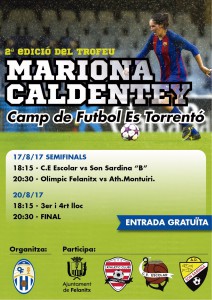 Mañana Domingo a las 20:30 en Es Torrentó se disputara la gran final de la 2ªEdición del Trofeo MARIONA CALDENTEY que organiza el OLÍMPIC DE FELANITX y que este año ha contado con la presencia de los siguientes clubes : C.E Escolar, Son Sardina y Athletic Montuïri, el pasado jueves se disputaron las semifinales dando paso a la final al Son Sardina al derrotar por 5 goles a 2 al C.E Escolar y al Athletic Montuíri venciendo en la tanda de penaltis al anfitrión y vigente campeón del trofeo tras empatar a 1 ! Por otra parte antes de la final se jugara a las 18:30 el partido por el 3/4 puesto que enfrentará al anfitrión contra el C.E Escolar ! Desde el club queremos dar las gracias a los equipos participantes y como no a nuestra anfitriona y campeona MARIONA CALDENTEY !!