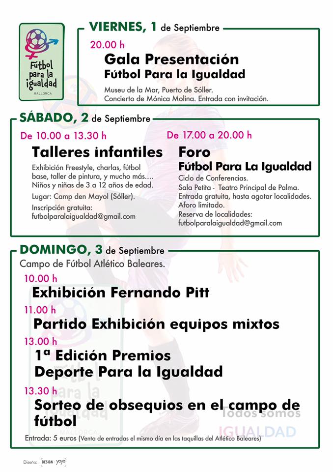 El programa de FÚTBOL PARA LA IGUALDAD prevé actos durante todo el fin de semana. Mañana, velada musical en Sóller a las 20:00 horas, en una Gala de Presentación. El sábado, talleres infantiles por la mañana en el campo de Sóller, y por la tarde; Foro de Fútbol para la Igualdad en el Teatro Principal de Palma, con asistencia del seleccionador español femenino, Jorge Vilda.