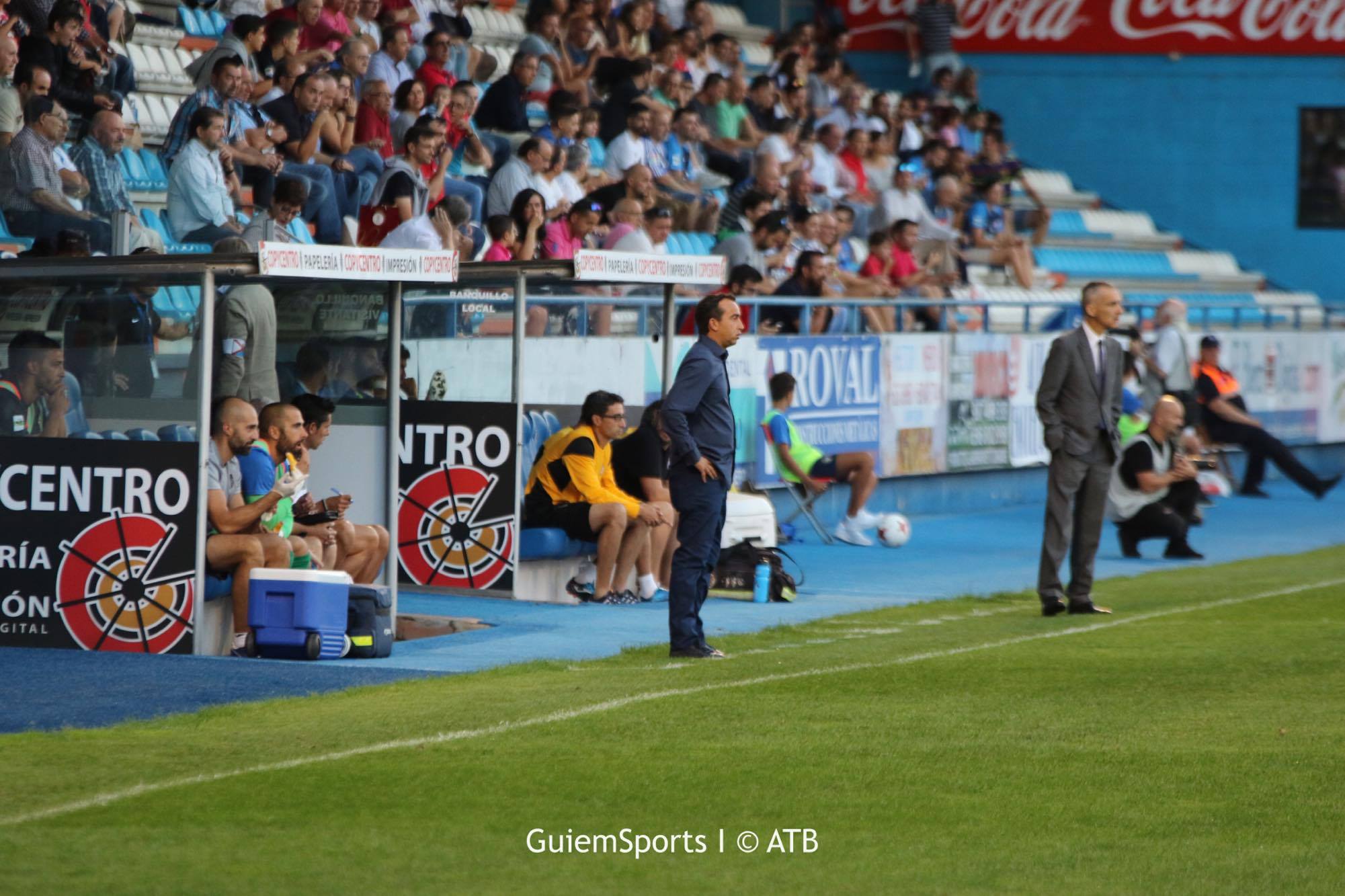 Armando de la Morena dispuso pocos cambios en comparación a las alineaciones de las tres primeras jornadas de liga. Volvían a los laterales Marcel y Migue pero repetía la pareja de centrales Sergio y Manu, el doble pivote para Fullana y Borja, bandas para Julio y Rodri y en punta Xisco y Oliva. El ATB empezó muy bien, dominador del partido y en el minuto 4 Rodrigo tuvo un mano a mano que rechazó a bocajarro el portero local. En el minuto 7 Delgado se retiró lesionado tras una dura entrada. Le sustituyó Kike. El control del balón era claramente del ATB y también las ocasiones. En el minuto 10 una falta magistralmente lanzada por Xisco hace lucirse a Dinu que evita el gol. Unos minutos más tarde es Kike en una gran combinación quien chuta a las manos del portero de la Ponfe. Eran los mejores minutos del ATB, con un control del juego por parte de Borja, Fullana y Xisco y con dos puñales como Kike y Rodri que generaban peligro. La única ocasión clara de la primera parte de la Ponfe fue un cabezazo desviado fuera de Pallarés que remata de centro de córner. En el 32 el árbitro anuló un gol a Rodri en una buena combinación entre Oliva y Kike por supuesto fuera de juego. Con el 0-0 se llegó al descanso.