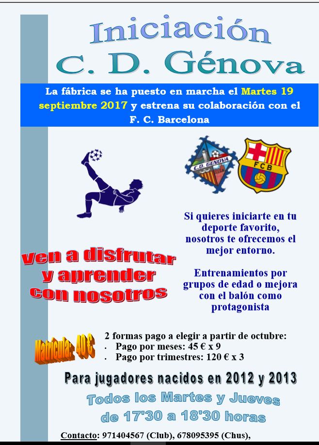 El C. D. Génova, estrenando la colaboración firmada con el F. C. Barcelona el pasado mes de marzo, informa a todos los que les pueda interesar que desde el martes 19 de septiembre del 2017 se ha puesto de nuevo en marcha la Escoleta para jugadores nacidos entre el año 2012 y 2013, todos los martes y jueves de 17’30 a 18’30 horas.