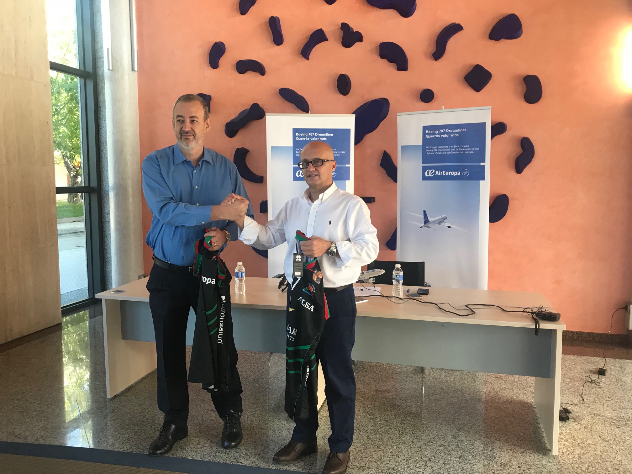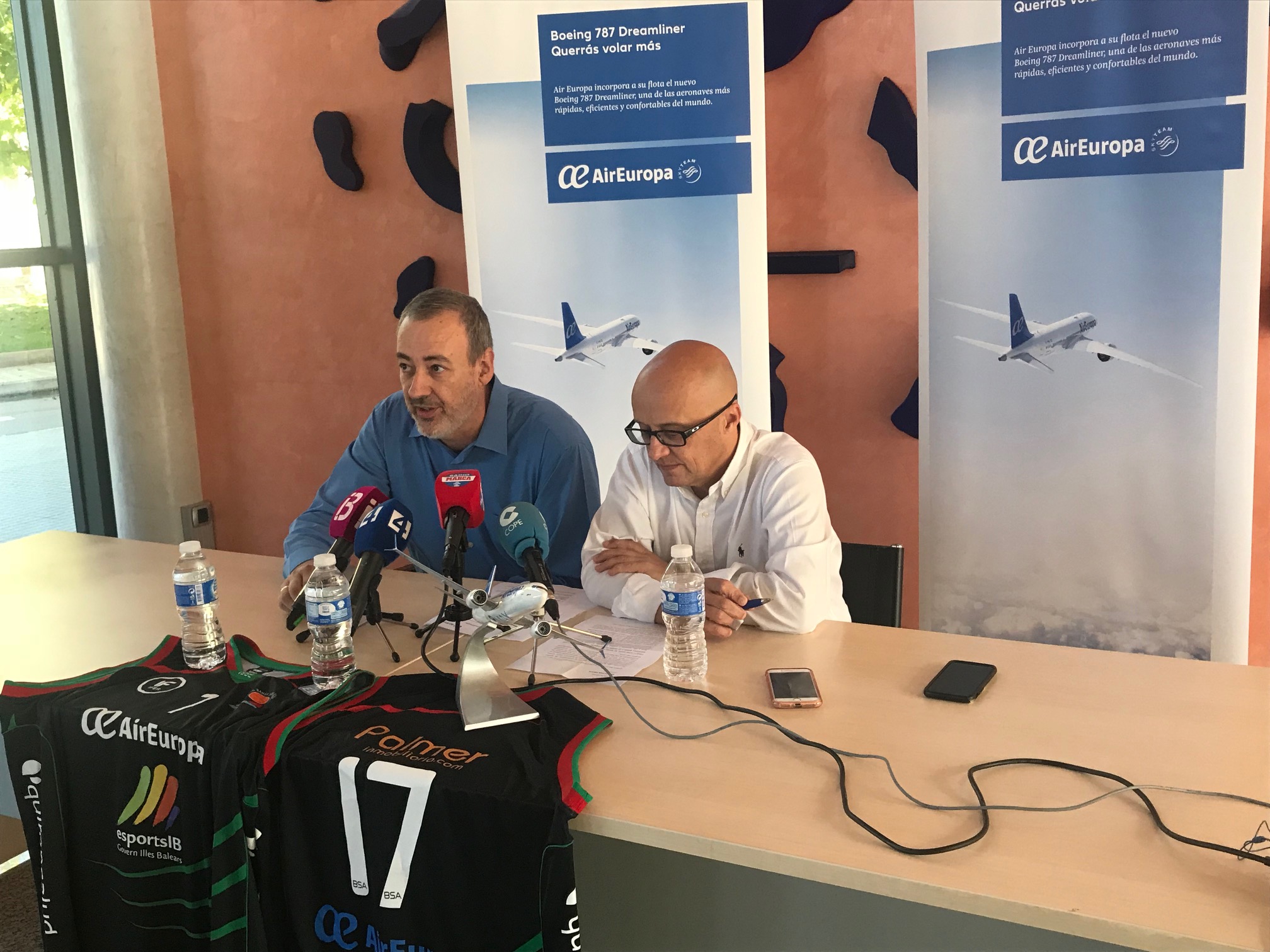IMG_0786El presidente del IBEROSTAR Palma, Guillem Boscana, y el Subdirector General de Air Europa, Richard Clark han presentado hoy en rueda de prensa el acuerdo de renovación de patrocinio entre ambas entidades en la sede de Globalia en Mallorca. Guillem Boscana ha querido agradecer la renovación de la colaboración entre Air Europa y el club y ha afirmado que “los últimos años han sido maravillosos y en gran parte ha sido gracias a la colaboración de Air Europa”.